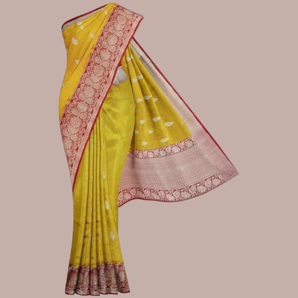 “Bunkar Sarees” presents an elegant Banarasi Pure Silk Saree in a breathtaking dual-tone radiating yellow, designed to shimmer with every movement. This beautiful plain saree is adorned with intricate Banarasi boota, woven delicately throughout, adding a subtle yet stunning texture to the fabric. The saree features a contrasting Banarasi kadwa zari border in a rich red color, beautifully framing the saree and giving it an air of regal sophistication.